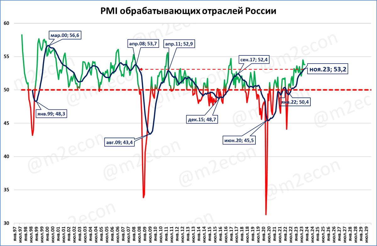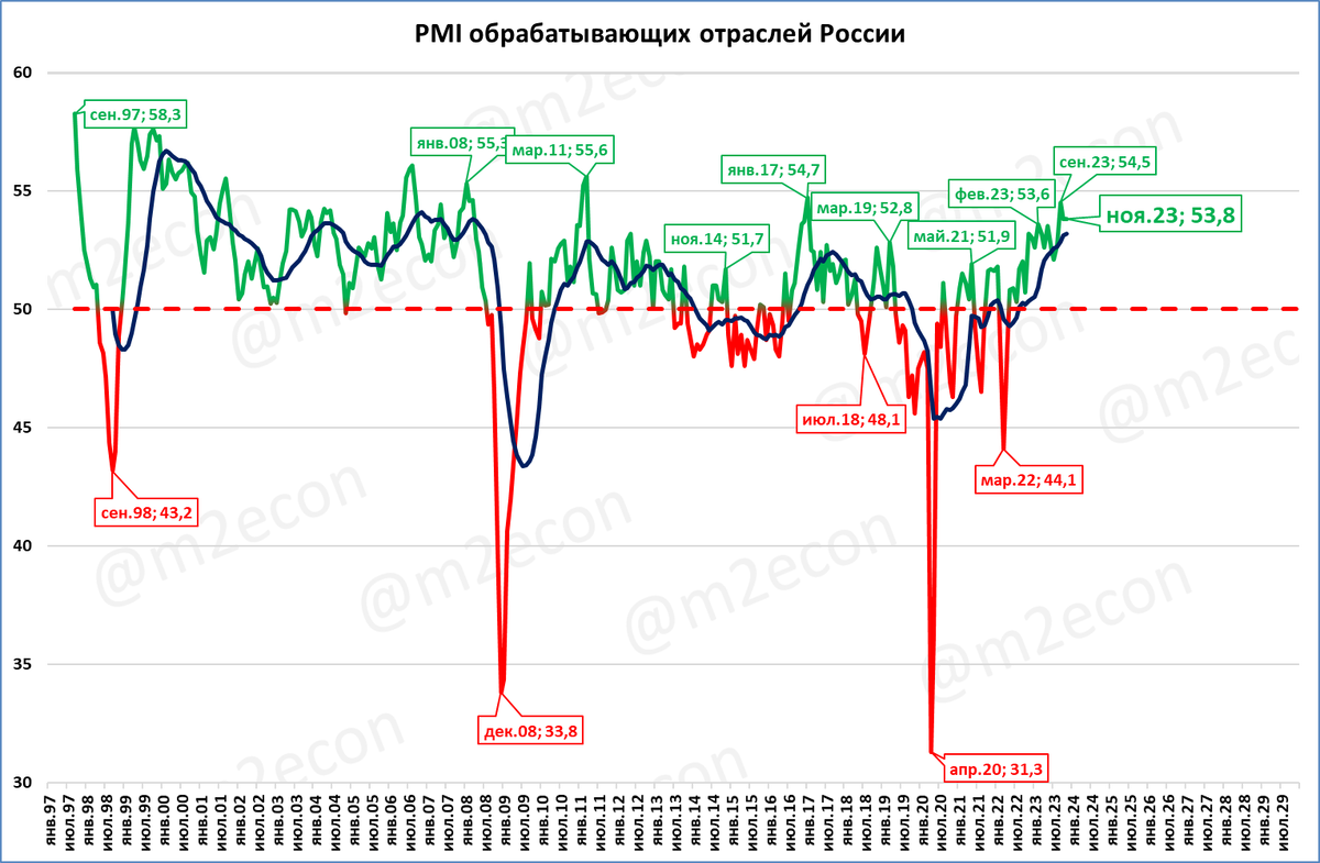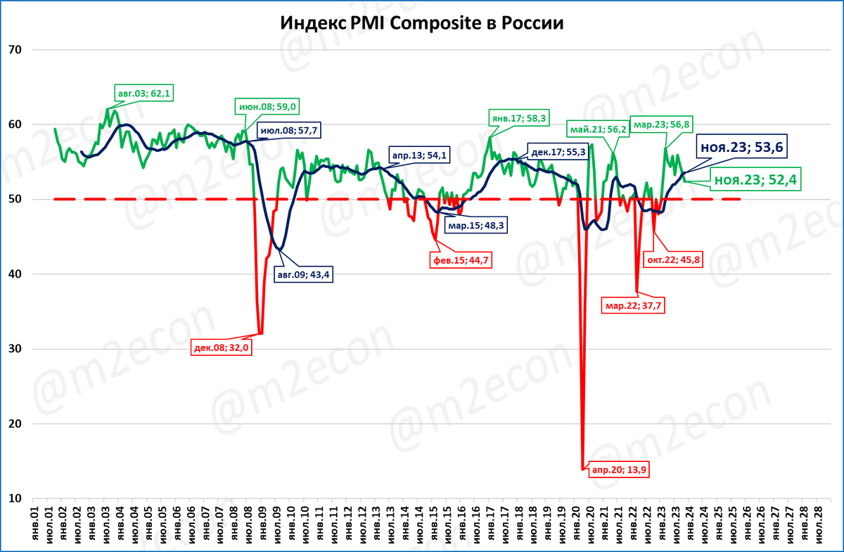 Индексы PMI показывают рост деловой активности в России в ноябре 2023 года и в промышленности, и в сфере услуг.