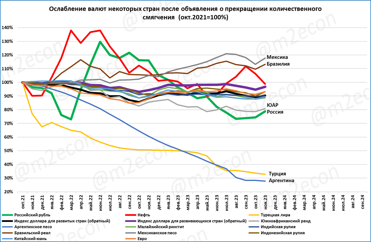 Выше мы уже отмечали, что рубль входит в тройку наиболее просевших валют, наряду с аргентинским песо и турецкой лирой.