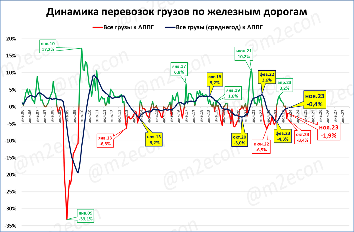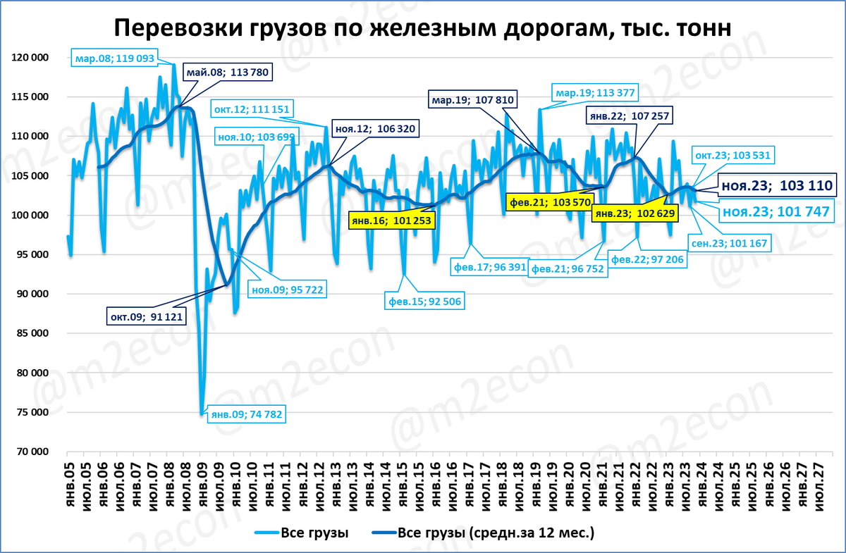 По предварительной оценке, перевозки грузов по железным дорогам в ноябре, составили 101,7 млн. тонн – это худший ноябрь с 2009 года.