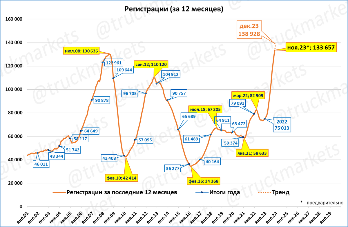 Текущий тренд ведёт к результату 2023 года на уровне 139 тыс. (соответствует продажам декабря около 15 тыс.).