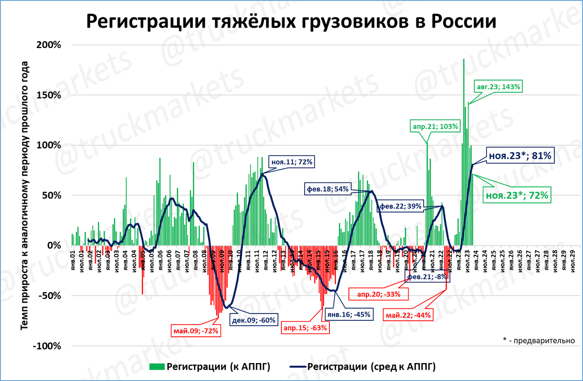 Если темп первых 11-ти месяцев (+39%) сохранится до конца года, то по его итогам продажи вырастут до 936 тыс. тяжёлых грузовиков.