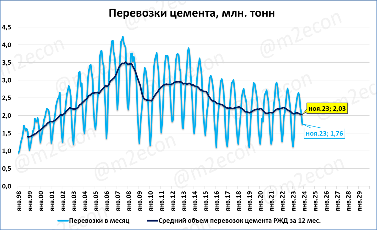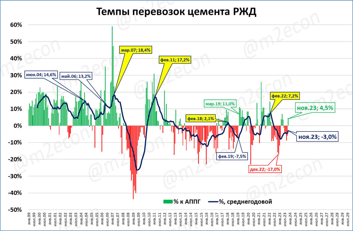 Перевозки цемента в ноябре (+4,5%), первый месяц роста после полугодового падения.