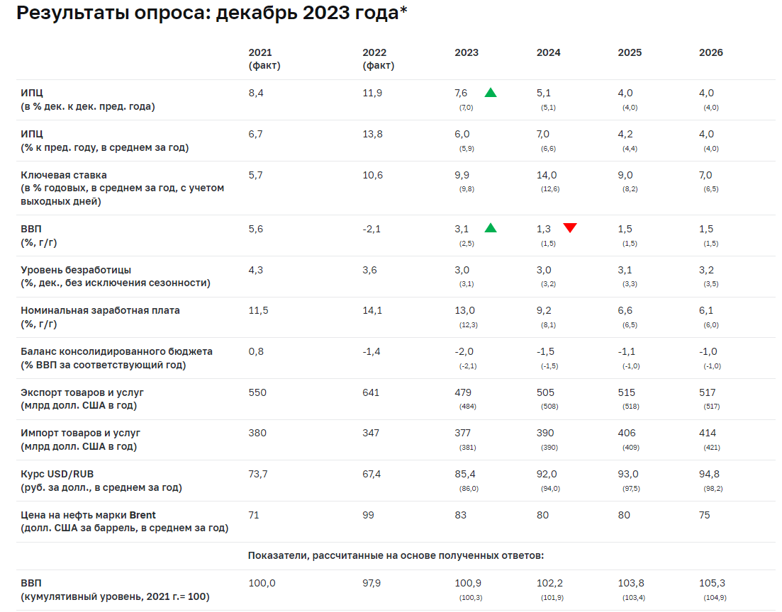 Результаты опроса ЦБ в части прогноза ВВП, как правило, консервативны. Ожидания экспертов повышаются под давлением обстоятельств и отстают от действительности. Так, прогноз 2023 года по росту ВВП пересмотрен с +2,5% до +3,1%. Но при этом президент Путин уже озвучил ожидания роста в 3,5%.