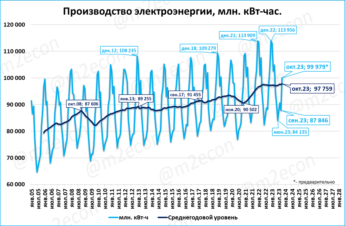 По предварительной оценке, производство электроэнергии в октябре составило 99,9 кВт-час. (предварительно, это лучший октябрь в истории).