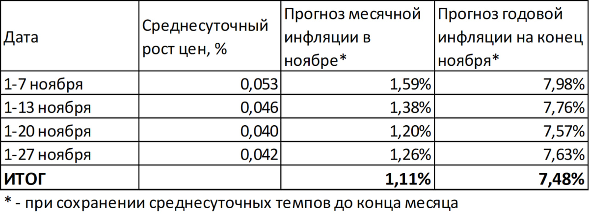 Инфляция по итогам ноября оказалась чуть лучше наших оценок по недельным данным. Ждали 7,63, а получилось 7,48%.