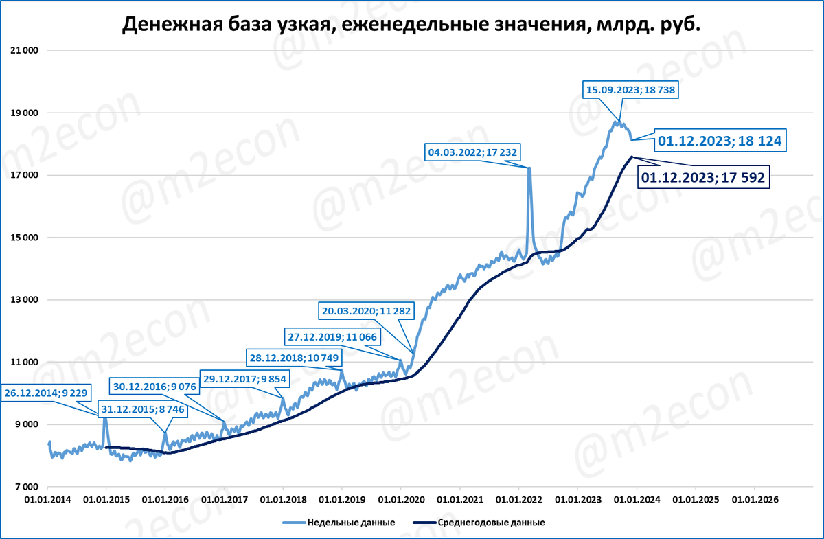 На 1 декабря узкая денежная база (УДБ) снизилась до 18 124 млрд. рублей.