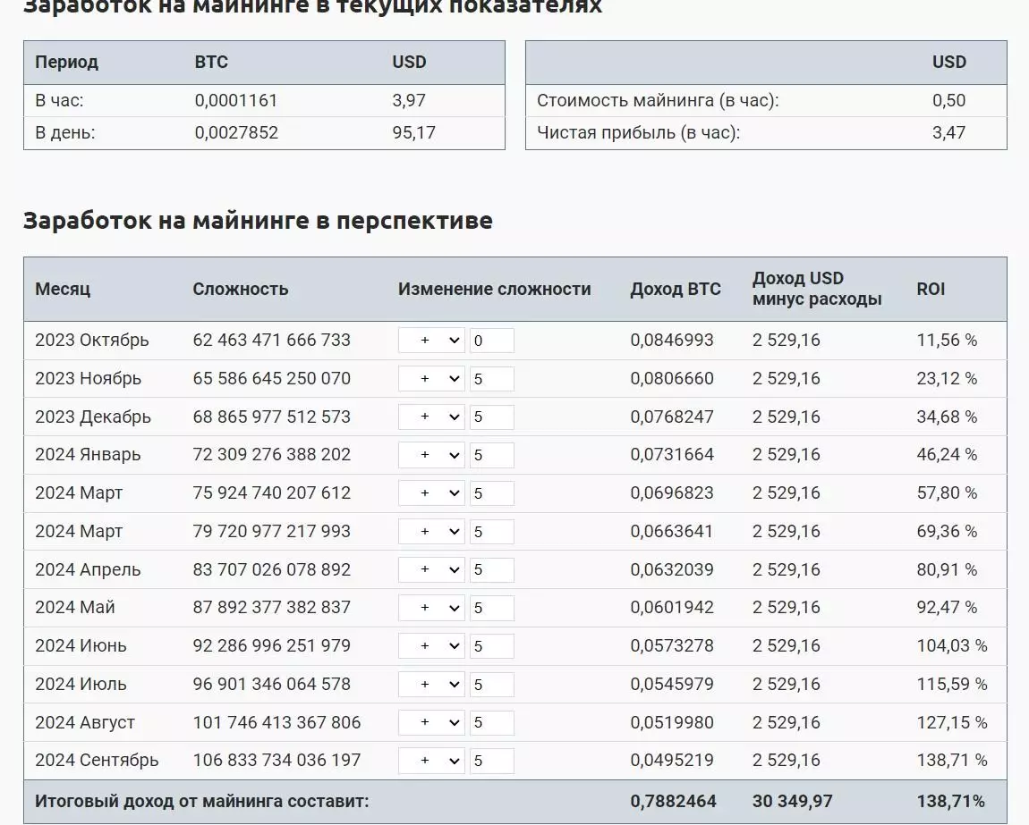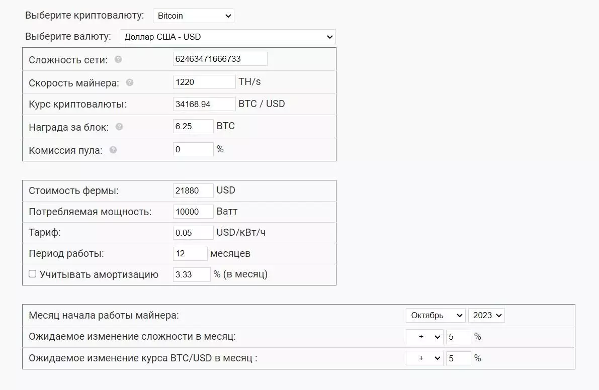 Для расчета годовой доходности устройства используем калькулятор майнинга. Он позволит посчитать фактическую доходность на основе входных параметров.