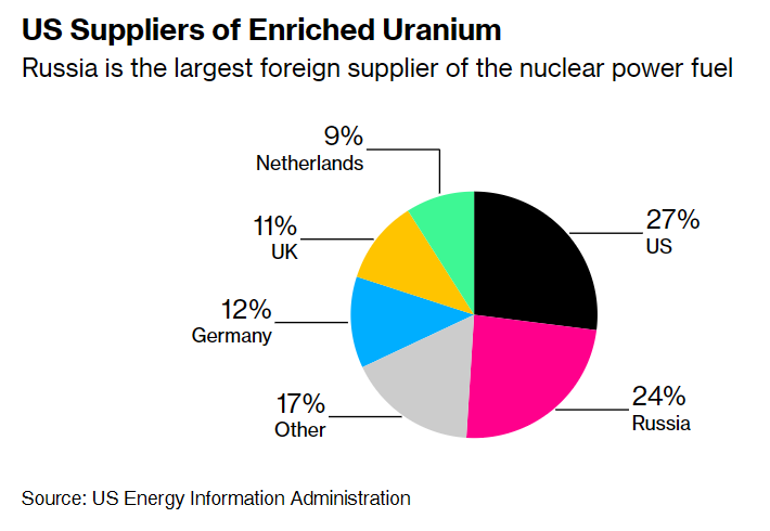 ...согласно данным Министерства энергетики, в прошлом году Россия поставила почти четверть обогащенного урана, используемого для американского парка из более чем 90 коммерческих реакторов, что делает ее иностранным поставщиком №1.