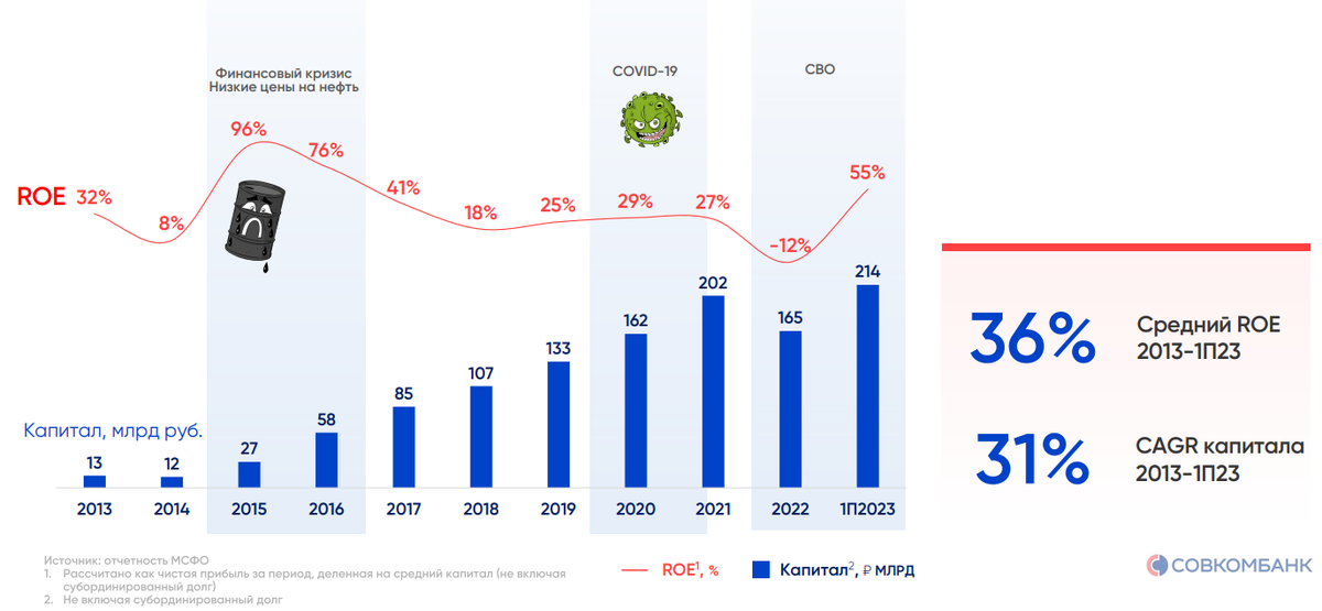 Основную часть суждений относительно Совкомбанка занимает вопрос рентабельности собственного капитала (ROE), который по итогам 9 мес. 2023 вырос до уровня 51%. По заявлениям Сергея Хотимского (основного бенефициара и акционера Совкомбанка) это разовый эффект от успешных операций с валютой, драгоценными металлами и замещающими облигациями.