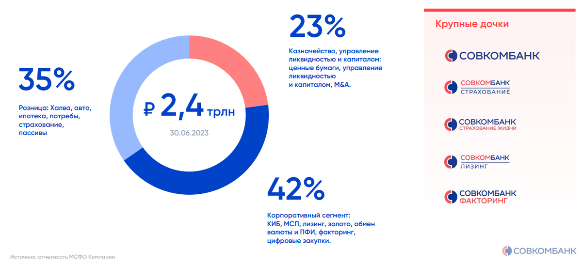 В рамках раскрытия информации Совкомбанк предоставил информацию о распределении активов по сегментам. По итогам 6 мес. 2023 г. активы банка составили 2,4 трлн руб., основную часть которых (около 42%) формирует корпоративный сегмент (КИБ, МСП, лизинг, золото, обмен валюты и ПФИ, факторинг, цифровые закупки), 35% приходится на розницу (флагманский продукт "Халва", авто, ипотека, потребительские кредиты, страхование), оставшиеся 23% относятся к казначейству, управлению ликвидностью и капиталом (ценные бумаги, управление ликвидностью и капиталом, M&A).