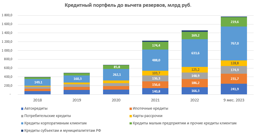 Несмотря на то, что карты рассрочки по итогам 9 мес. 2023 г. занимают около 7% кредитного портфеля, однако при этом являются наиболее маржинальным продуктом (доходность 31% годовых). Банк делает существенный акцент на данном продукте и считает его одним из своих фишек. В 2021-2022 гг. карты рассрочки занимали по 8,5% соответственно и так же были наиболее маржинальными среди других составляющих кредитного портфеля.