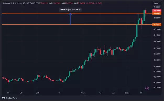 Динамика криптовалюты Cardano с 7 по 15 декабря 2023 года оказалась более внушительной в сравнении с биткоином и эфиром. Монета прибавила более 17%. Cardano демонстрирует положительную динамику вот уже на протяжении девяти недель подряд.