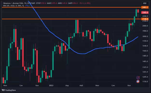 По техническому анализу пока рано делать выводы о том, что бычий тренд сменился на медвежий. Из последних девяти недель только две были в отрицательной зоне, и то меньше чем на 5%. Уровень поддержки $2 140,8 не пробит, что говорит о силе покупателей. Так же, как и нахождение цены выше 50-недельной скользящей средней (обозначена синим). Если у вас на руках сейчас нет эфира, то дальнейшие покупки разумно осуществлять в случае пробития уровня сопротивления — $2 403,1.