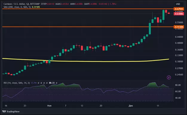 С точки зрения технического анализа, у Cardano бычий тренд. Это подтверждается тем, что цена находится выше 200-дневной скользящей средней (обозначена желтым). Однако он идет уже достаточно давно. Чем дольше монета будет расти, тем выше вероятность коррекции. Индикатор RSI с 6 декабря находится в зоне перекупленности (медвежье предзнаменование), что характерно для рынков с ярко выраженным трендом. Ориентироваться на него без учета других факторов не стоит. Сказать, что на рынке воцарились медведи, можно только после пробития уровня поддержки $0,51. Дальнейшего роста стоит ожидать, если удастся преодолеть уровень сопротивления около $0,68.