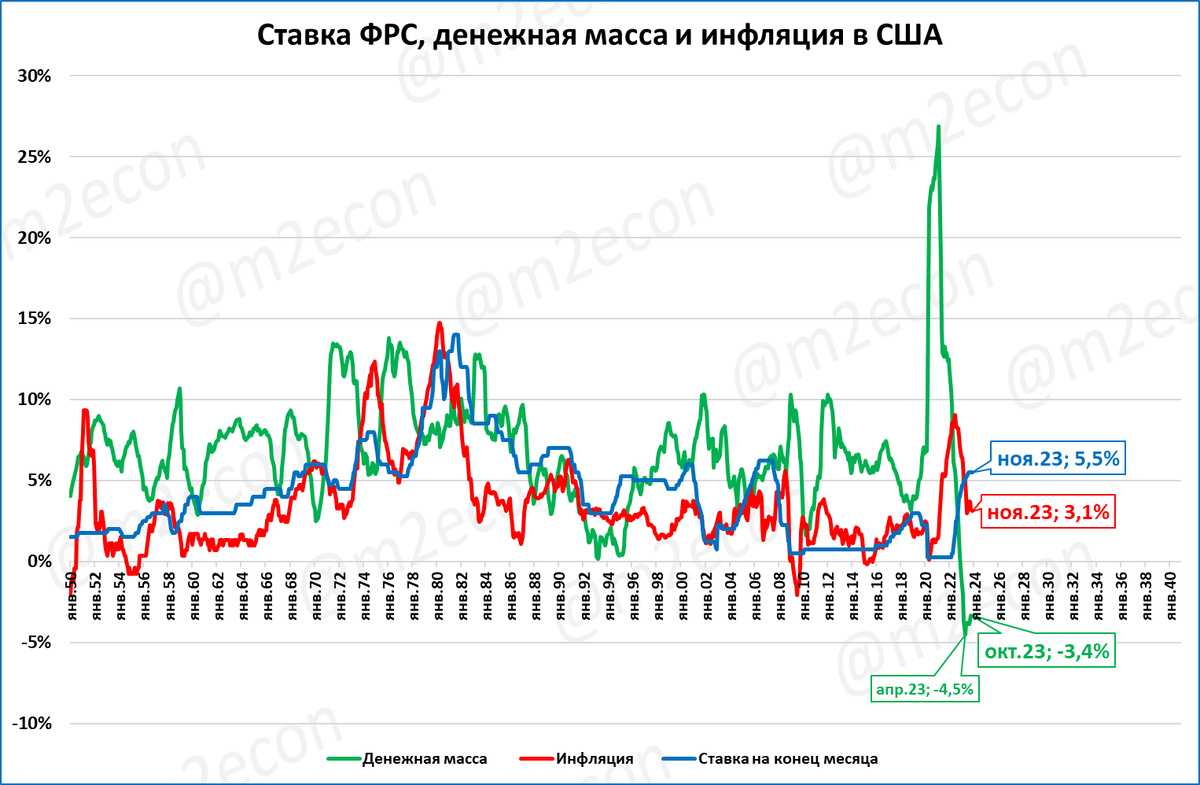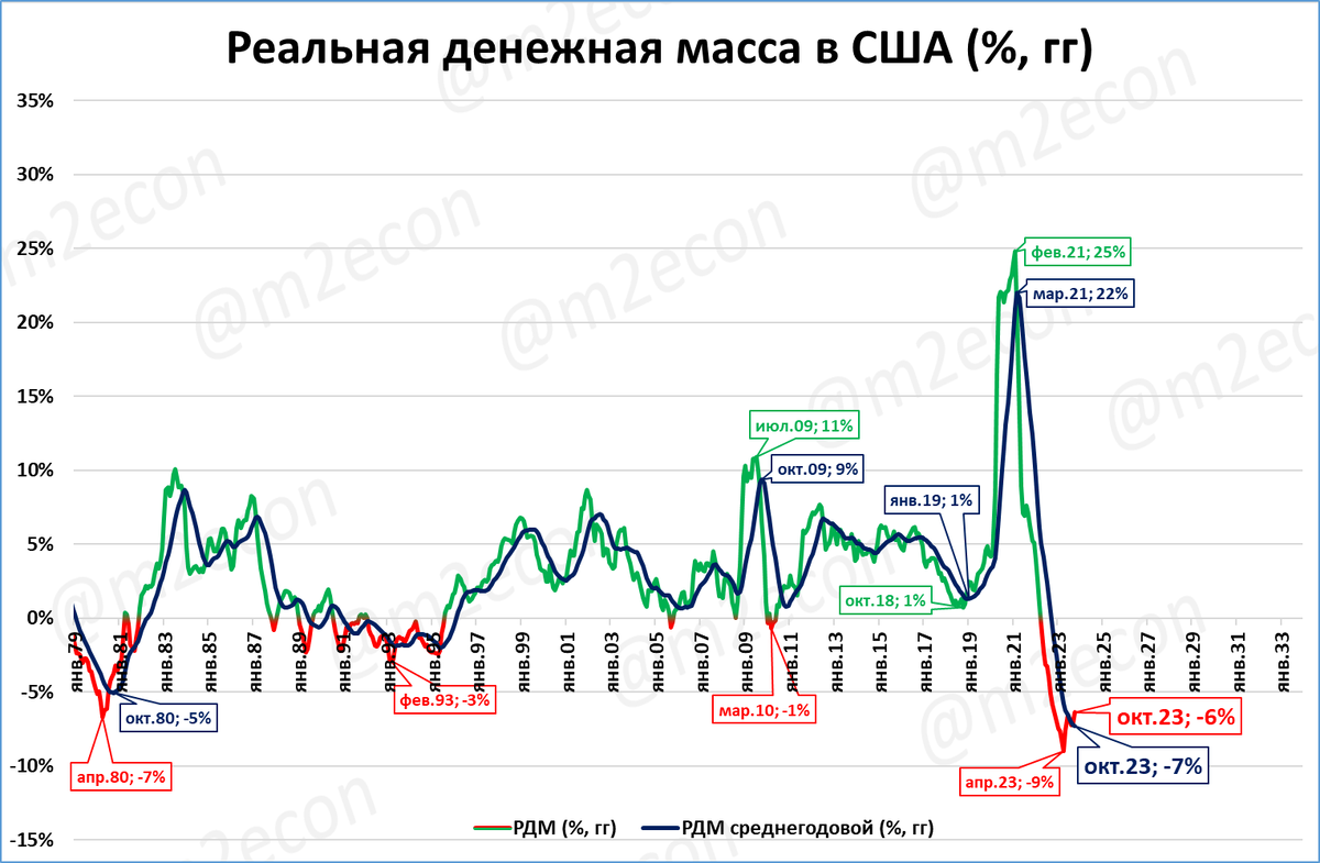 Но даже эта стабилизация инфляции не спасает США от падения денежной массы, которая сокращается с апреля 2022 года. По итогам октября падение денежной массы составляет -3,4% годовых.