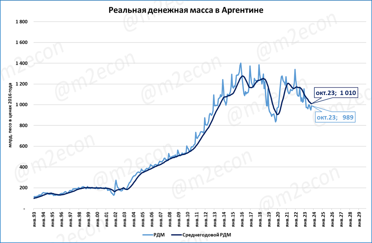 В Аргентине инфляция поднялась в ноябре до 161% годовых. Ставка ЦБ Аргентины при этом ниже инфляции (130%). Реальная денежная масса сокращается и сейчас находится на уровне десятилетней давности.