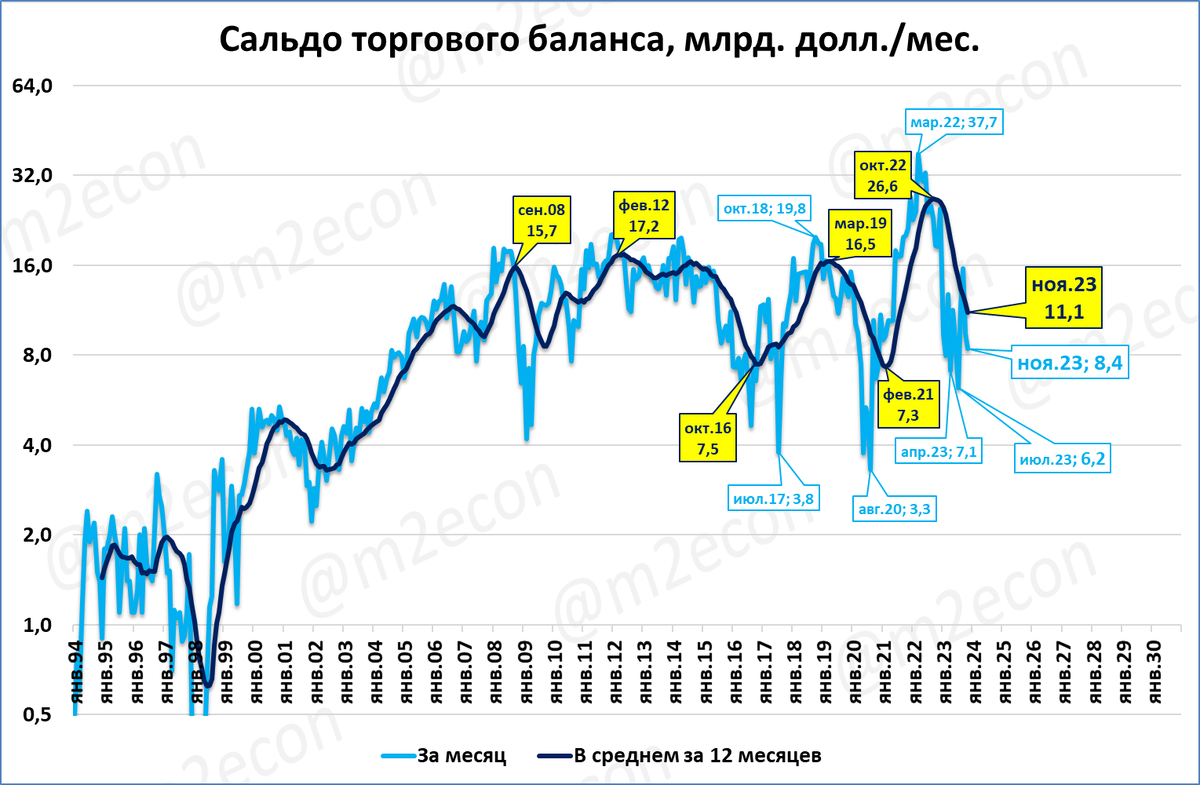 Сальдо торгового баланса в ноябре составило +8,4 млрд. долларов, что ниже, чем в ноябре прошлого года на 55%. Падение сальдо не является препятствием для роста ВВП в этом году.