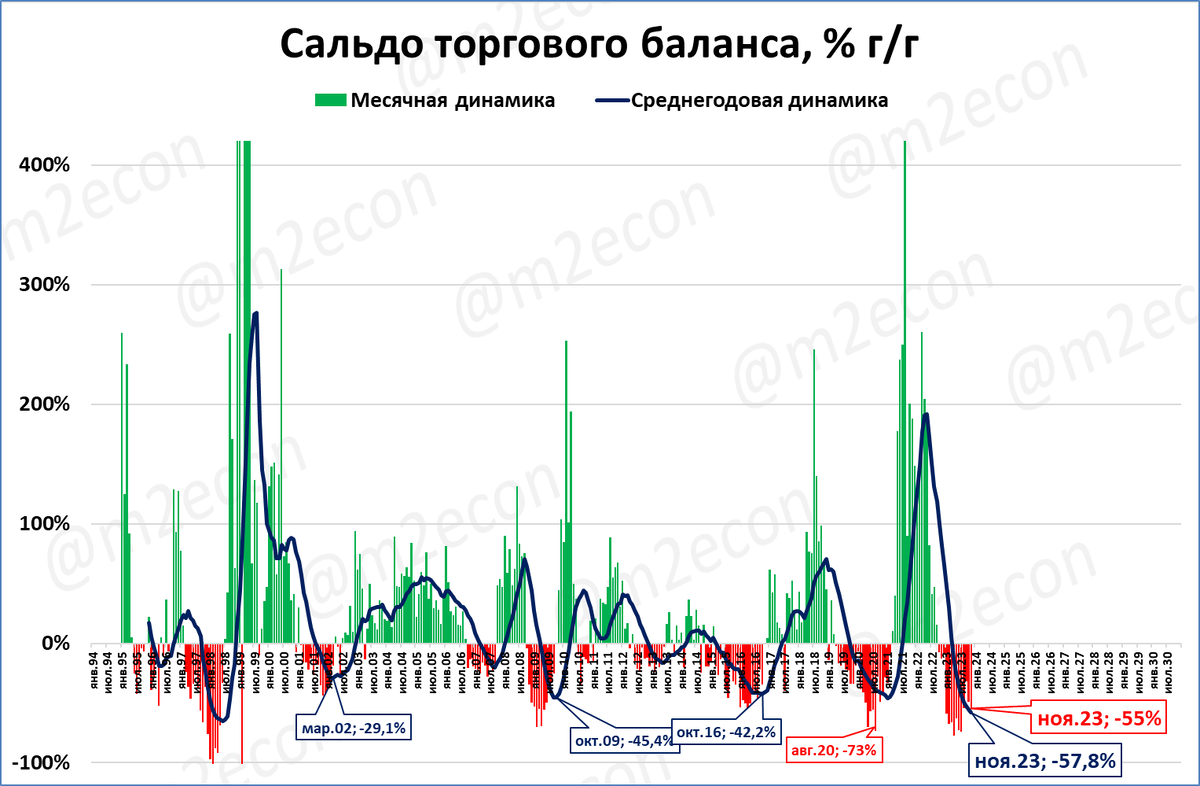 Как рост сальдо в 2022 году до исторических рекордов не помешал ВВП России сократиться, так и его падение в 2023 году не помешает экономике России вырасти. Исторический пример: 2001 год, когда при падении сальдо экономика выросла более чем на 5%.