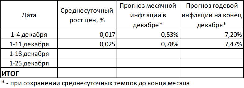 Среднесуточный рост цен с 1 по 11 декабря составил 0,025%.