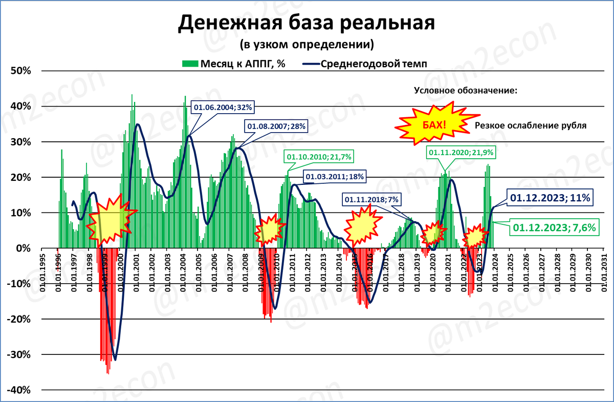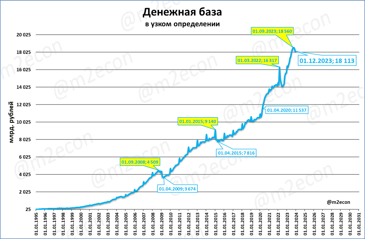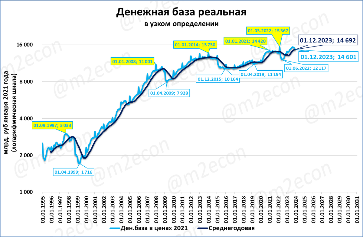 В результате сейчас реальная денежная масса находится на тех же уровнях, на которых находилась 10 лет назад, в 2013 году.