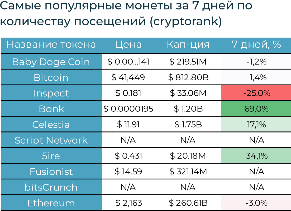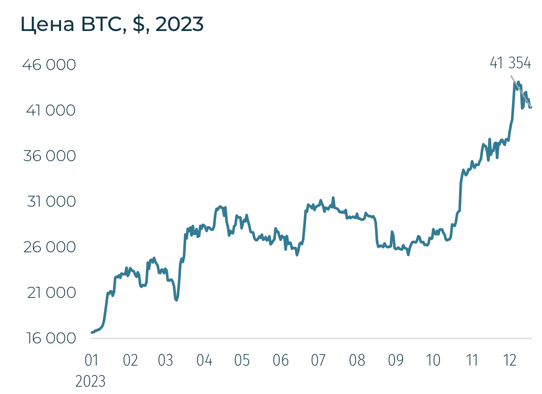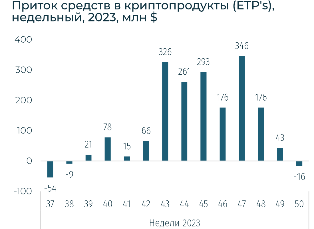 BTC вырос на незначительные 0,3%, при этом ETH подешевел на 2,9%, SOL, которая утроилась за последние несколько месяцев, — также замедлила рост до 0,5% за неделю. Притоки в криптопродукты оказались негативными — -$16 млн, после 11 недель притока. Это говорит о том, что спрос на криптопродукты в предверии одобрения спотовых ETF мог иссякнуть. И если, не развернется, то восстановится, когда SEC даст четкие сигналы о том, что одобрит их.