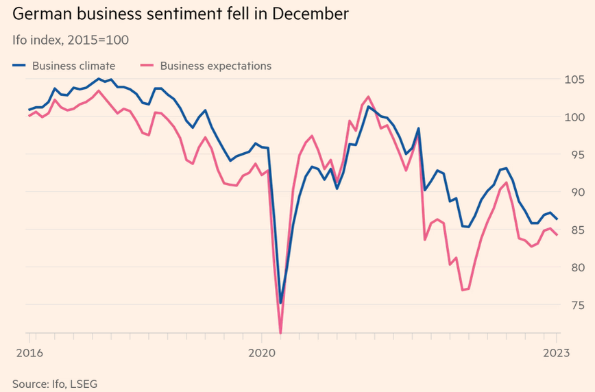 Индекс делового климата, подготовленный () Институтом Ifo в Мюнхене, упал до 86,4 в декабре, показали опубликованные в понедельник данные, по сравнению с 87,2 в предыдущем месяце и значительно ниже показателя в 87,8, прогнозируемого аналитиками в опросе независимого сми Reuters.