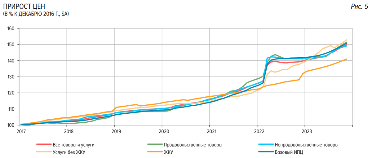 Данное изображение специально для тех, кто думает, что мы думаем, что у нас нет инфляции. Или что она у нас 7,5% (а она у нас 7,5%), когда она у нас все 50% (а она у нас и 50% тоже). Все зависит от точки приложения. Или от точки начала расчёта. Если мы начнём от декабря 2016 , то базовый индекс потребительских цен увеличился у нас чуть более чем на 50%. Сильнее всего подорожали услуги. Меньше всего - ЖКХ - более 40%.