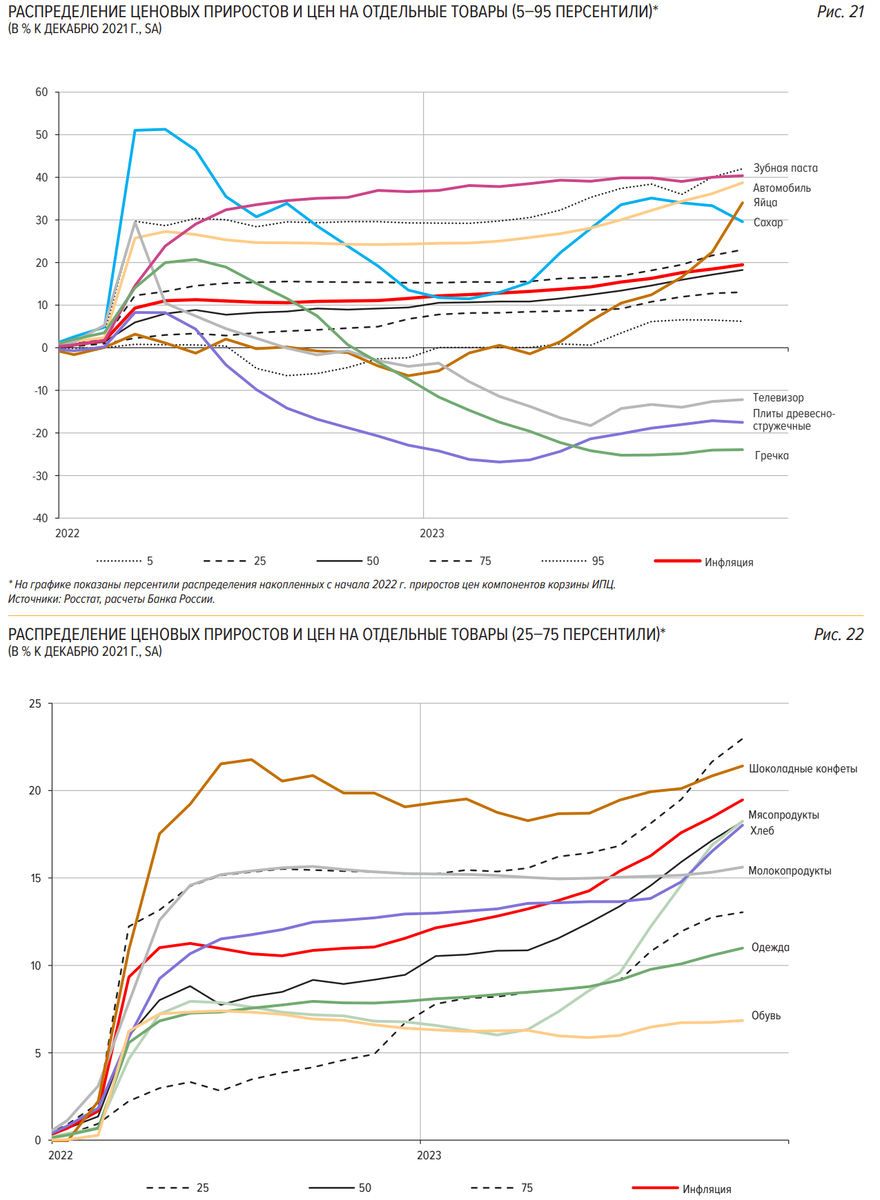Зона 50 персентиля идет в районе 18%. Т.е. половина товаров за два года выросла в цене менее 18%, другая половина более.