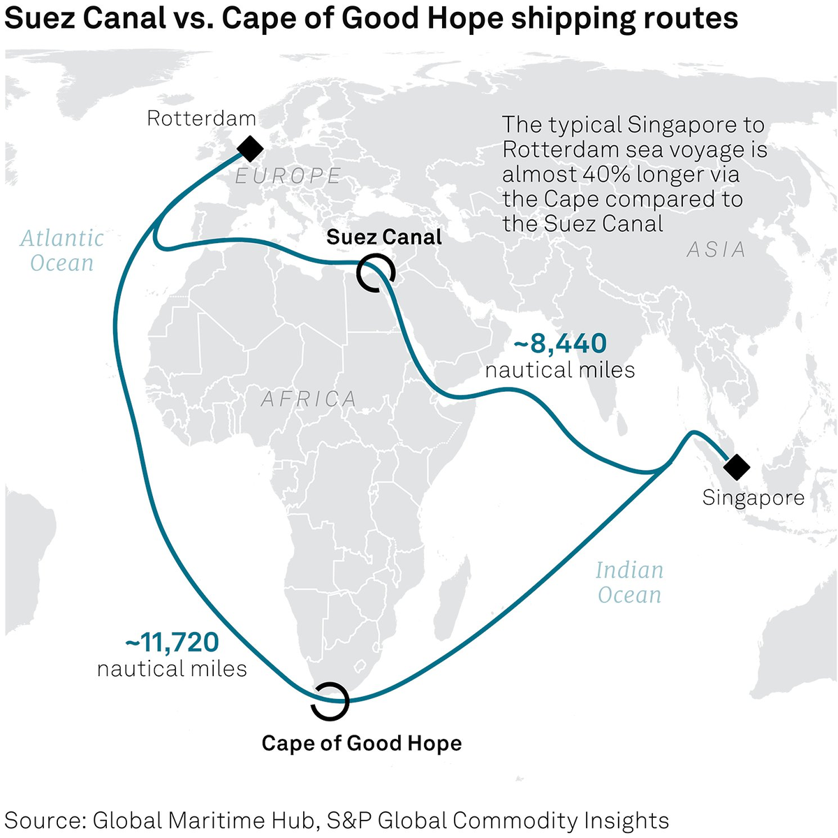 Тут нам говорят, что из, прости господи, Роттердама в Сингапур по Красному морю - 8 440 морских миль (13 582 км.), а через Мыс Доброй Надежды 11 720 морских миль (18 861 км.). Т.е. на 40% дольше. И дороже. И не факт, что на те же 40%.