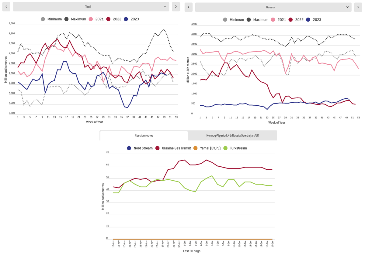 Для текущего календарного местоположения, поставки газа упали до минимальных значений с 2015 года. Т.е. не вообще на минимум-минимум. А для 50 недели года эти значения являются минимальными.