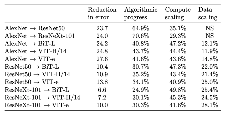 В среднем выходит, что около 45% улучшения произошло благодаря алгоритмической эффективности, еще около 45% – за счет увеличения объема вычислений (соотносится с 1-ой и 2-ой экспонентой в рамках этого цикла), оставшиеся 10% - за счет роста обучающих данных (соотносится со 2-ой экспонентой). При этом стоит отметить, что для более поздних лет (последние строчки в таблице) роль алгоритмической эффективности немного падает, замещаясь объемом данных для обучения. Если мы учтем наш вывод по 2-ой экспоненте о том, что данные скоро закончатся, алгоритмическая эффективность может вновь набрать большую значимость.