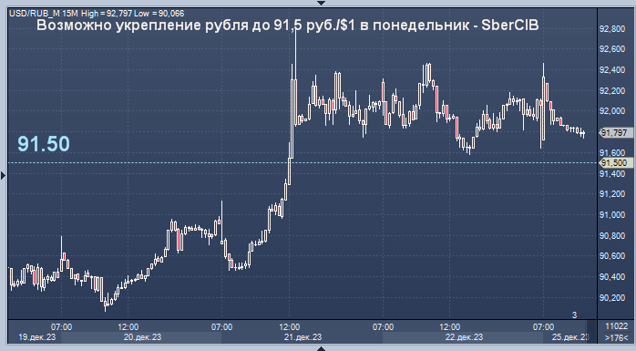 "Доходности ОФЗ с фиксированным купоном в пятницу снизились в среднем на 5 б.п. Оборот торгов был в несколько раз ниже среднего показателя за декабрь. В ближайшие дни мы не ждем существенных изменений на рынке российского госдолга ввиду приближения праздников. Однако, по всей видимости, на нем будут преобладать покупатели - многие участники рынка желают разместить в ОФЗ свободные денежные средства на период длинных выходных", - отмечают аналитики SberCIB в материале.