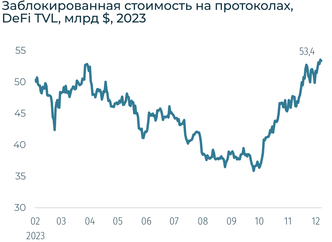 Solana. С начала года цена SOL выросла в 11 раз до $121,6, в т.ч. +61% за последнюю неделю. Для сравнения капитализация всего рынка за аналогичный период выросла всего на 117% и 8%. Капитализация SOL сейчас составляет $52,5 млрд, что помещает ее на 3-е место (ex. USDT). В ноябре 2022-го, когда биржа FTX обанкротилась, цена SOL упала с $30 до $15. Причина — слухи о связях и использовании Solana для преступных целей Сэмом Бэнкманом-Фридом. Однако несмотря на крах биржи, объемы торгов SOL (24 часа) выросли с того времени с $0,8 млрд до $5 млрд, количество активных пользователей с 0,6 тыс. до 0,8 тыс, а заблокированная стоимость (TVL) — с $0,4 млрд до $1,5 млрд