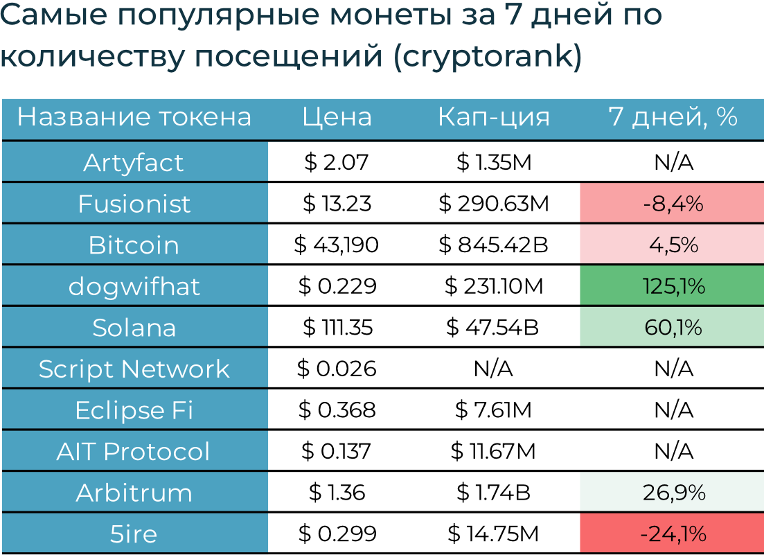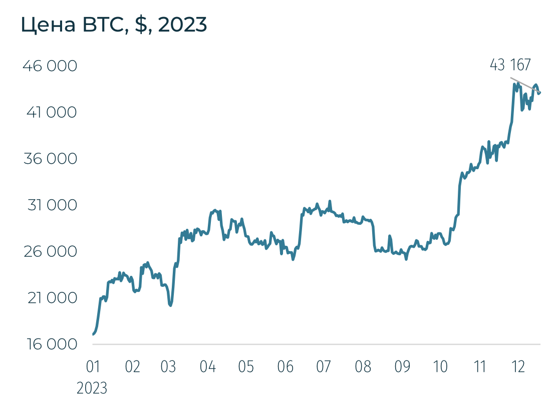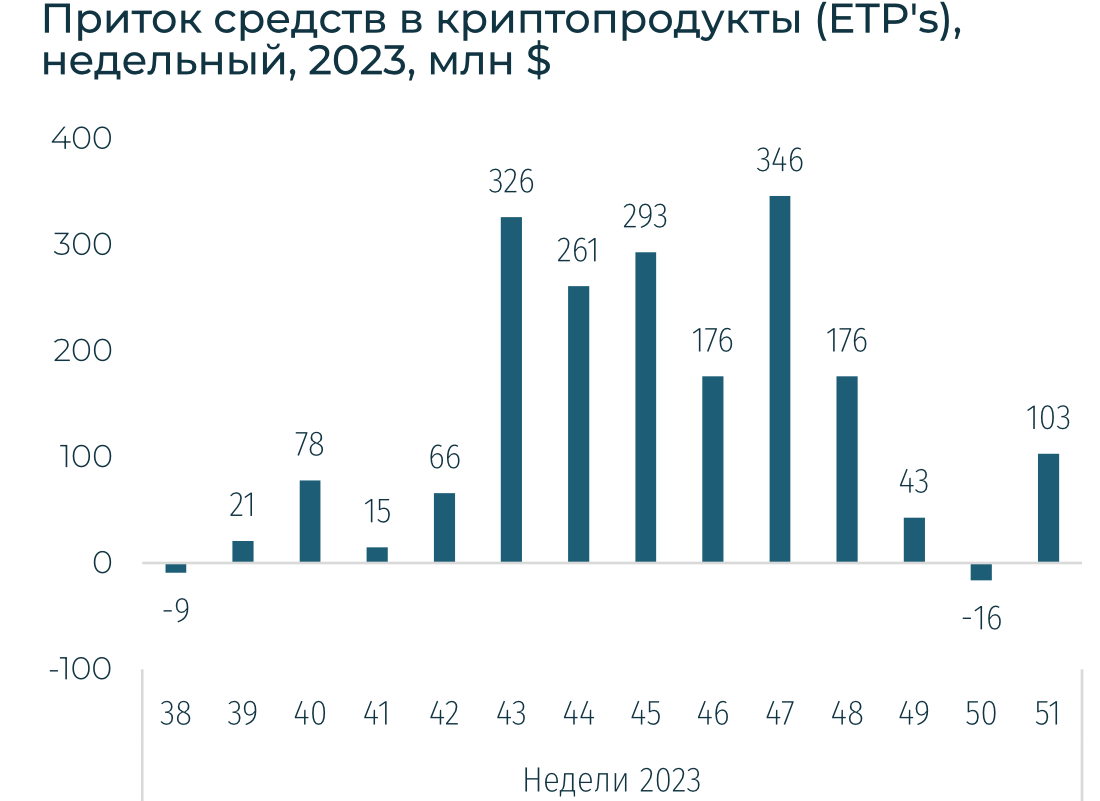 Фокус недели. Первые спотовые ETF могут появиться 10 января 2024, SEC. 21 декабря SEC встретилась с заявителями на спотовые BTC-ETF: BlackRock, Grayscale Investments, ARK Investments, и 21 Shares. Встречу также посетили представители потенциальных мест торговли: Nasdaq и Cboe; адвокаты эмитентов. SEC запросила обновить заявки до 29 декабря: технические спецификации, комиссии и стратегии первоначального привлечения капитала. Добавила, что компании, пропустившие дедлайн, не попадут под потенциальные одобрения в январе. Дедлайн по обновленной заявке от Ark и 21 Shares — 10 января 2024. Ark и 21 Shares заявили комиссию для ETF — 0,8%. Для сравнения крупнейший ETF на S&P500 (0,09%).
