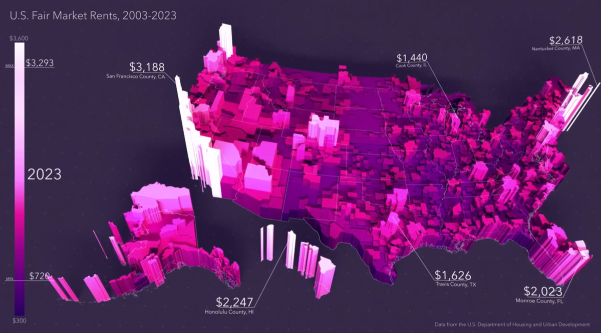 Дивная инфографика изменения стоимости аренды недвижимости в США по округам за последние 20 лет.