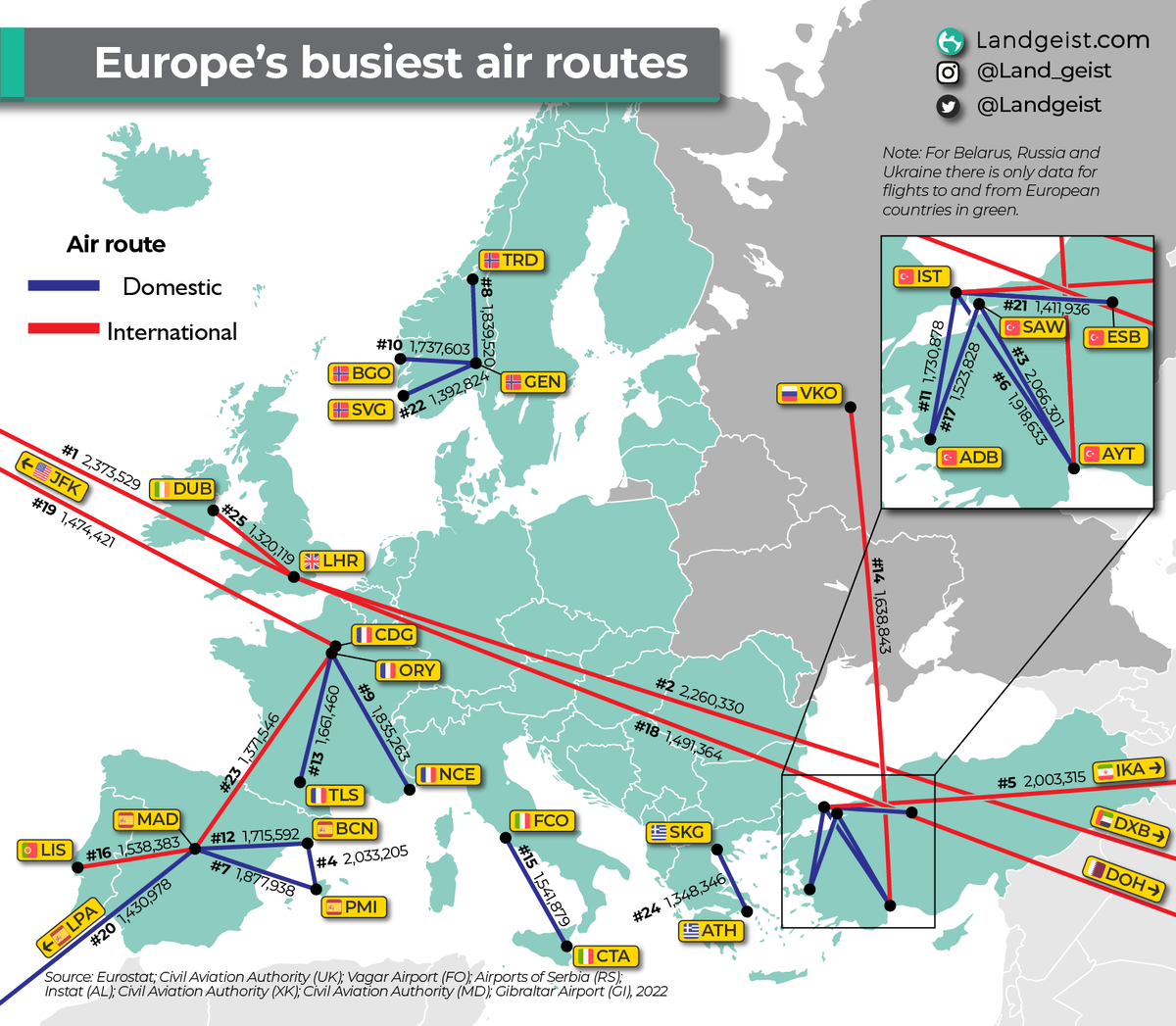✈️ 25 самых загруженных авиамаршрутов Европы 2022 года.