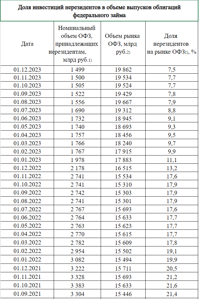 Доля нерезидентов на российском рынке ОФЗ в ноябре снизилась до 7,5% с октябрьских 7,7%, тем самым показатель обновил минимум с середины 2012 года, следует из материалов Банка России.