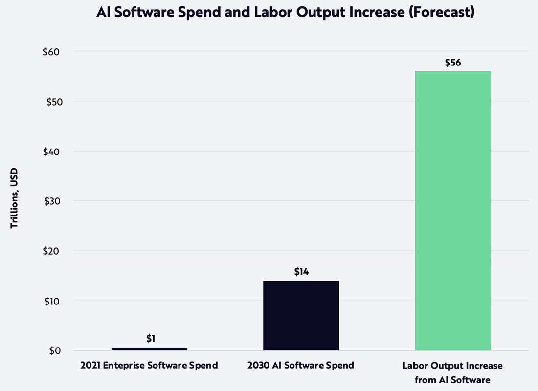 На этом графике мы видим 14 триллионов долларов выручки только для софтверной части ИИ-экономики. И 56 трлн. долларов экономического эффекта для валового мирового продукта. Это прирост порядка +56%. В принципе, лишь ненамного выше оптимистичного сценария «МакКинси» (с некоторой погрешностью, т.к. «МакКинси» рассчитывал сценарии автоматизации в человеко-часах, а не в стоимости этих человеко-часов). Зная репутацию “ARK Invest” в прогнозировании, теперь мы можем быть полностью уверены, что потеря половины рабочих мест из-за ИИ в 2030 нам не грозит.