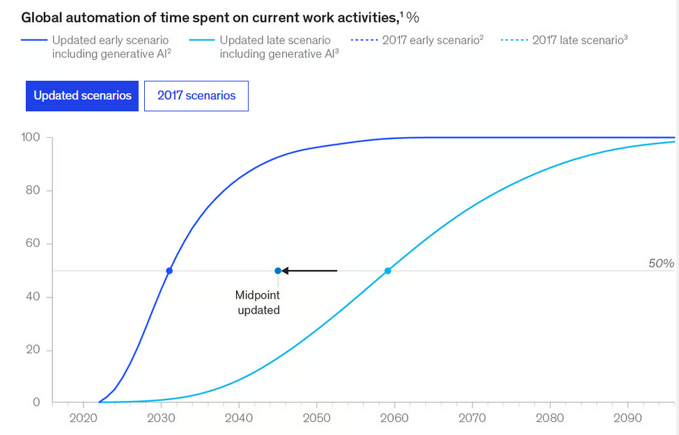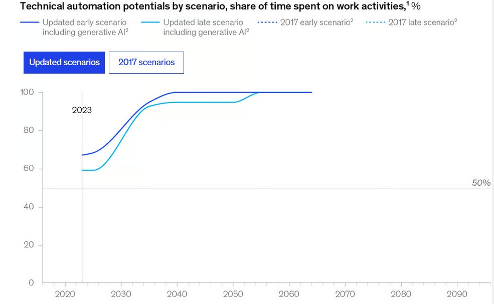 Сегодняшних технологий, по мнению аналитиков, хватает, чтобы автоматизировать 60%-70% человеко-часов труда в глобальном масштабе. Причем 60% - это консервативная оценка. В оптимистичном сценарии к концу 2030-ых эта доля достигнет 100%:
