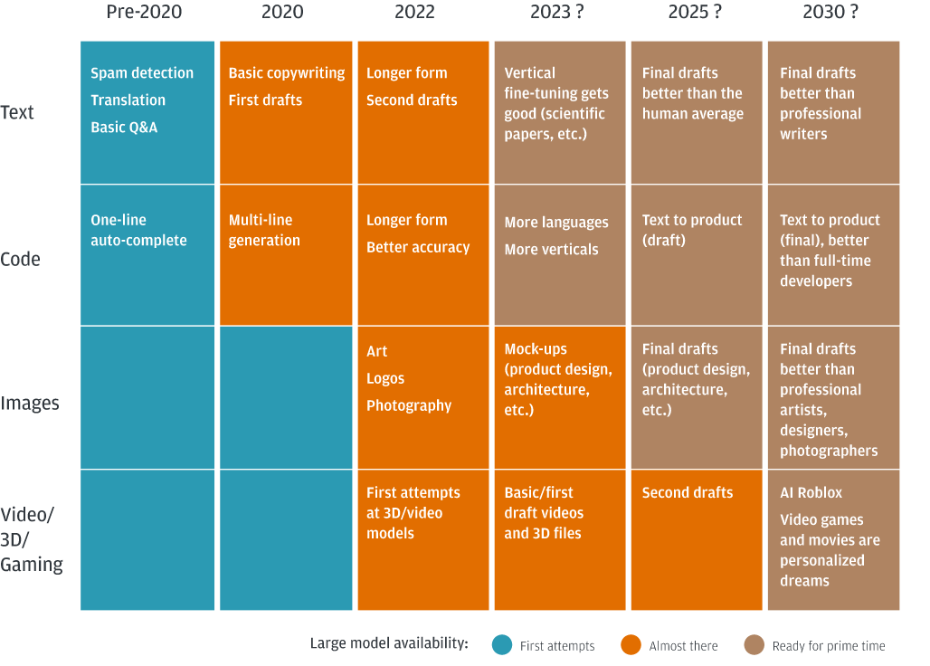 Давайте более подробно рассмотрим некоторые примеры внедрения ИИ в экономику — до сих пор мы ограничивались общими фразами вроде «повышение производительности труда» и «автоматизация рабочего времени». Начнем, пожалуй, с этого наглядного графика от ”Sequoia Capital”: