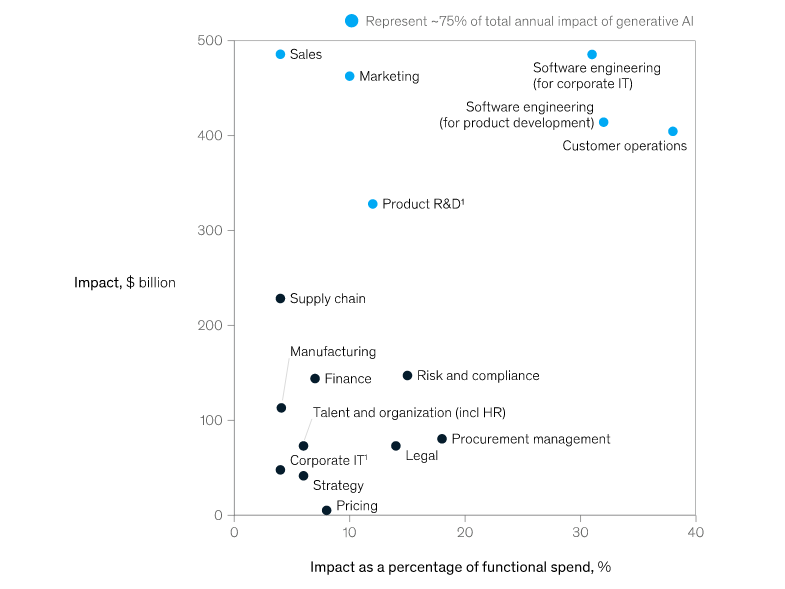 Вообще, отчёт «МакКинси» сделан на удивление добротно и профессионально — чем заметно выделяется на фоне большинства консалтерских глянцевых опусов, составленных людьми, мало что понимающими в теме, но хорошо владеющими трендовыми бизнес-терминами. Авторы подробно расписывают кейсы применения генеративного ИИ в разных профессиях, в основном затрагивая позиции «белых воротничков». Условному руководителю, не знакомому с ИИ, отчет действительно поможет сформировать представление о перспективном применении этой технологии в его бизнес-процессах. Обобщает эффект от ИИ вот этот график: