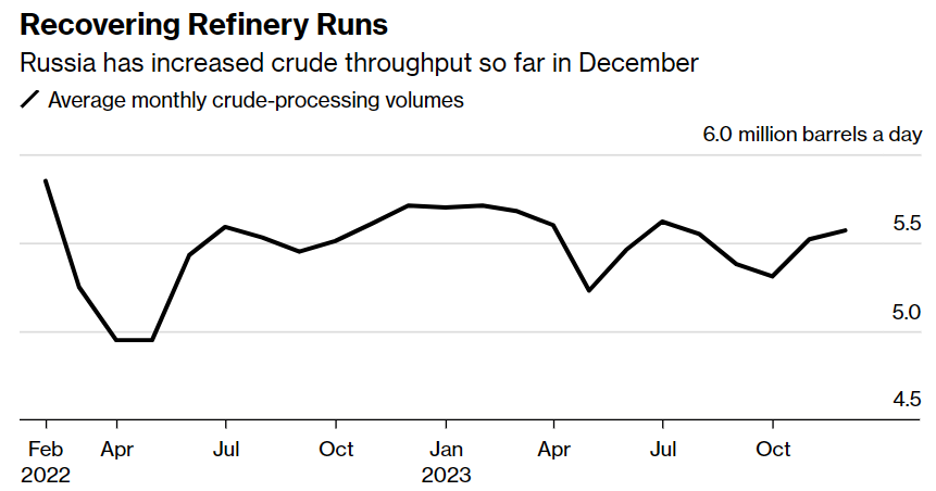 Согласно расчетам Bloomberg, основанным на исторических данных, ежедневная переработка сырой нефти в России в первые 20 дней декабря составляла в среднем около 5,57 млн баррелей в день, что почти на 60 000 баррелей в день больше, чем в течение большей части ноября.