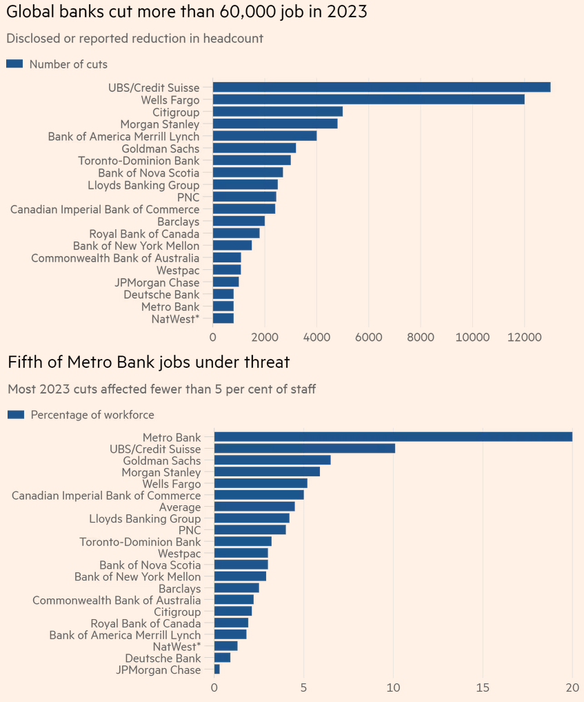 Двадцать крупнейших банков мира сократят по меньшей мере 61 905 рабочих мест в 2023 году. Во время глобального финансового кризиса 2007-08 годов тем же кредиторами было сокращено порядка 140 000 человек.