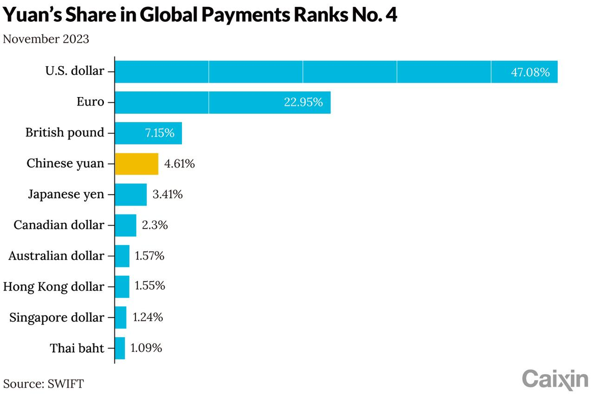 Мы уже писали на прошлой неделе, что юань достиг своего личного рекорда и по ноябрю месяцу занял 4,61% в свифтовских платежах. Оказывается, он впервые почти за два года стал четвёртой валютой в системе глобальных платежей, обогнав японскую иену.