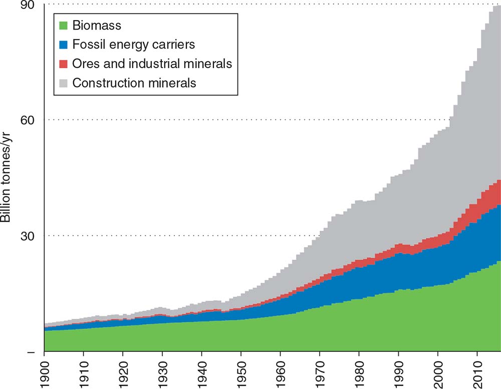Мировое потребление природных ресурсов, в млрд. тонн/год. Тоже экспонента, которую некоторые (например, Медоуз) хоронят уже полвека