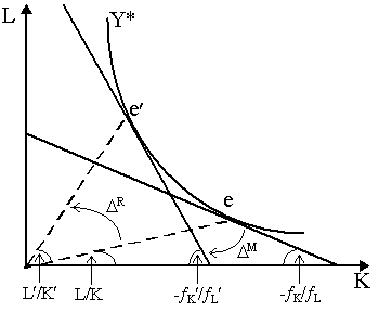 Кривая Y* показывает нам возможные сочетания затрат L и K, приводящие к одинаковому объему выпуска. Обратим внимание на её форму. Допустим, мы хотим нарастить выпуск — сдвинуть Y* вверх и вправо — не меняя затраты L. Чем больше мы увеличиваем K, тем более горизонтальна линия Y и тем больше капитала нам приходится затрачивать на единицу увеличения Y. В пределе затраты капитала стремятся к бесконечности, а прирост Y – к нулю.