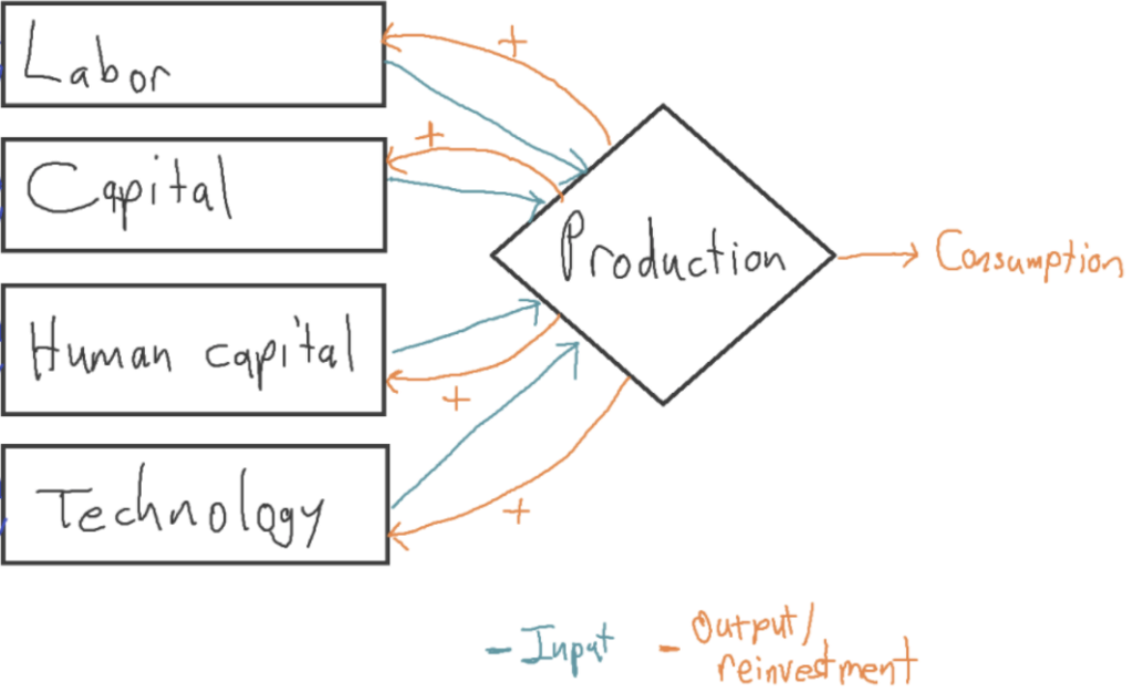 Здесь мы видим 4 главных фактора производства: труд, капитал, человеческий капитал и технологии. Затраты (т. е. использование) этих факторов конвертируется в выпуск — он же валовый продукт.