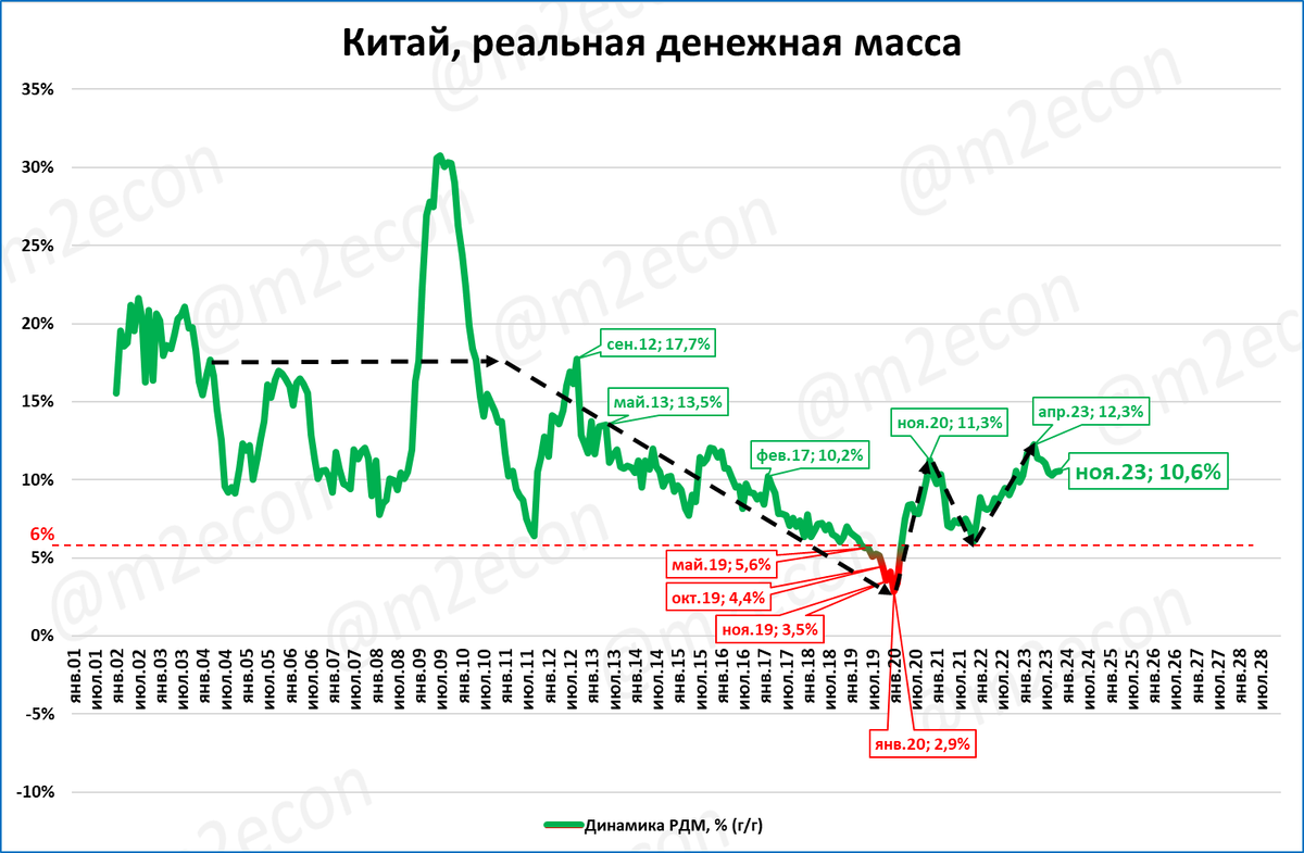 Прогноз: мы ожидаем, что рост ВВП Китая будет ускоряться, учитывая динамику реальной денежной массы.