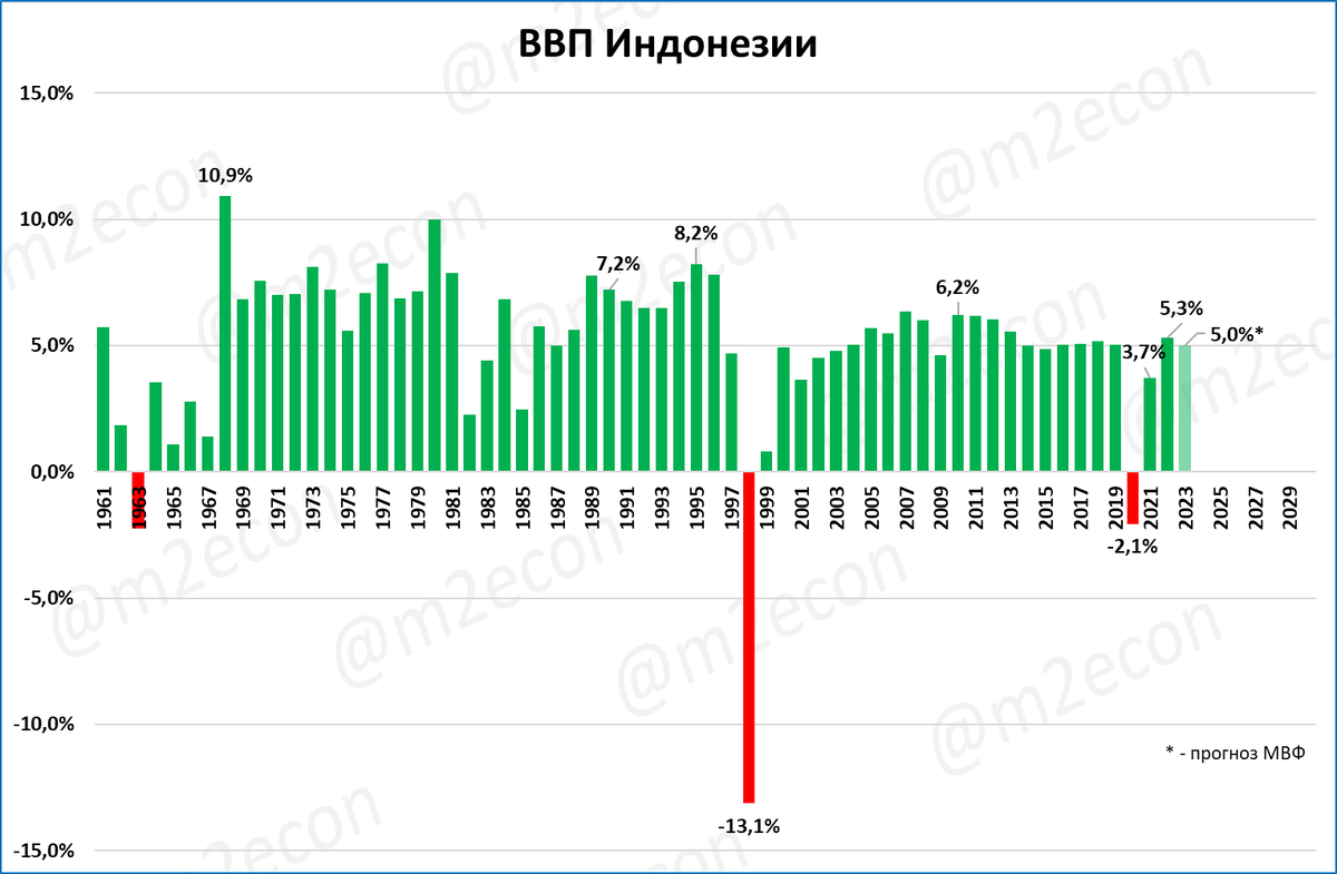 Учитывая более быстрые темпы роста ВВП Индонезии, ей даже прочили выход на шестое место, а России – скатывание на седьмое. (см., например, МВФ спрогнозировал вытеснение России с шестого места среди экономик мира в 2024 году | Forbes.ru) .