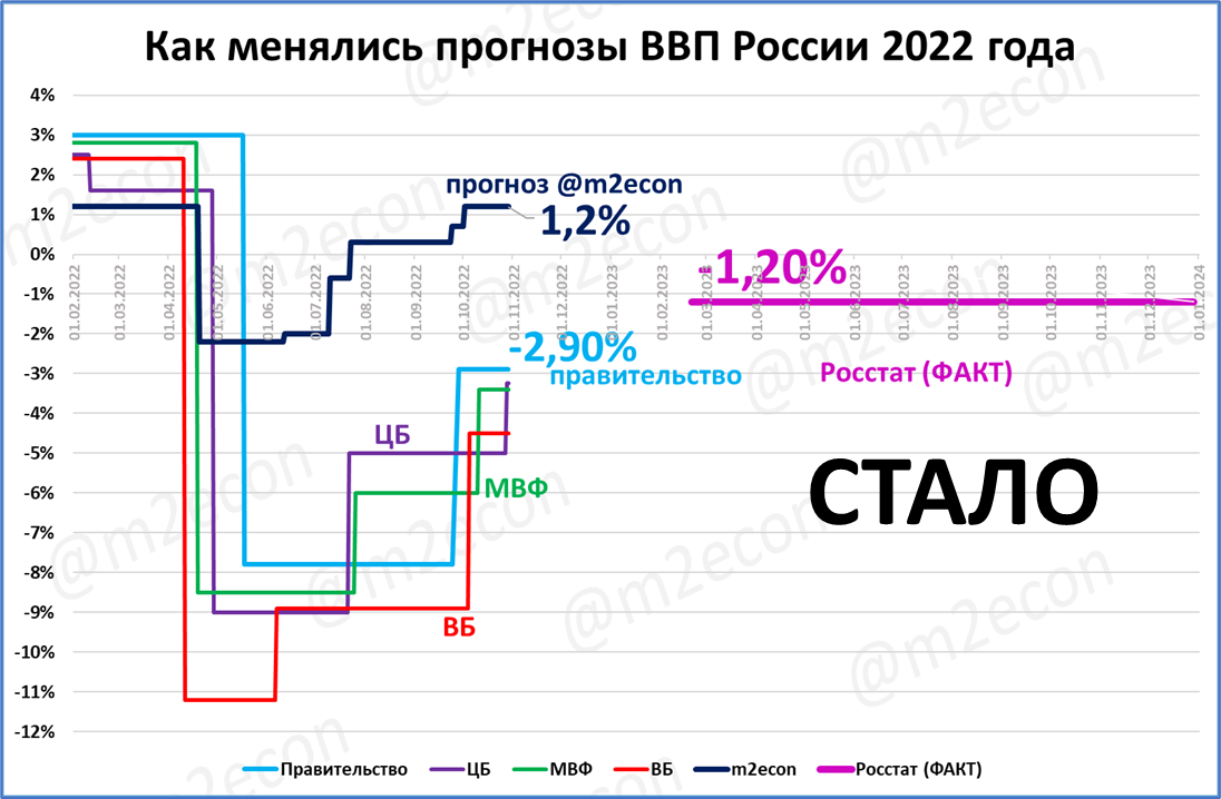 По точности прогнозов, данных весной 2022 года, после начала СВО, мы со своим прогнозом (-2,2%) оказались намного ближе к первой оценке Росстата (-2,1%, см. график), чем прогнозы ЦБ, правительства, МВФ и Всемирного банка, которые предполагали падение экономики на 8-11%.